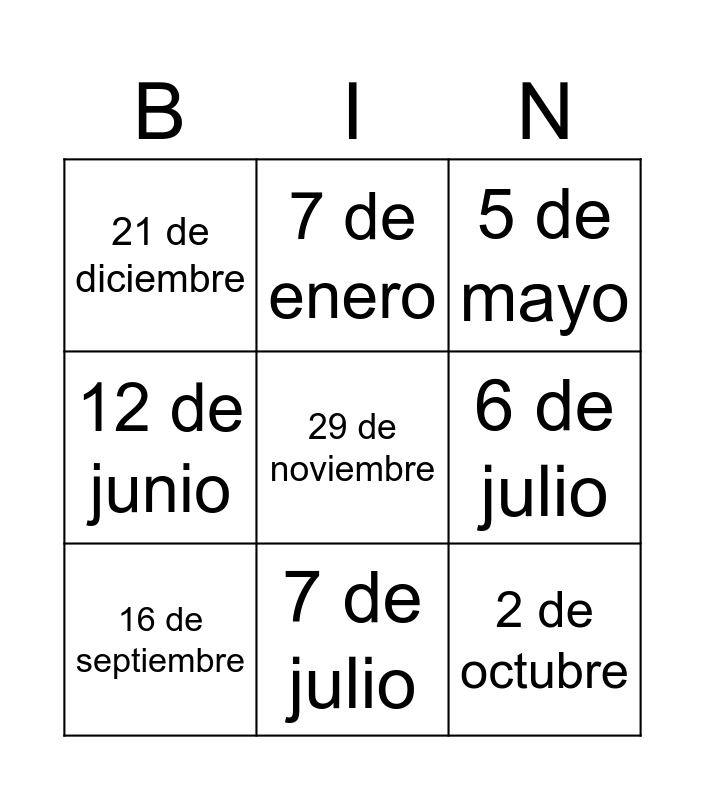 This bingo card has 21 words: 8 de agosto, 3 de julio, 7 de enero, 13 de febrero, 9 de agosto, 16 de septiembre, 21 de diciembre, 5 de mayo, 11 de abril, 7 de julio, 2 de octubre, 12 de junio, 19 de octubre, 15 de diciembre, 6 de julio, 15 de enero, 10 de octubre, 23 de abril, 29 de noviembre, 4 de noviembre and 17 de febrero.