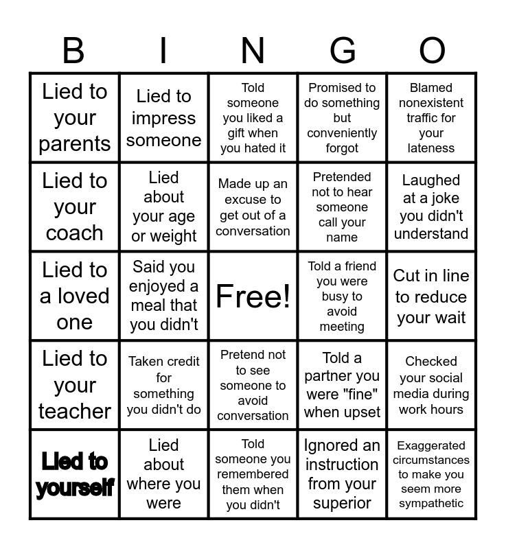 This bingo card has a free space and 24 words: Lied to yourself, Taken credit for something you didn't do, Made up an excuse to get out of a conversation, Ignored an instruction from your superior, Blamed nonexistent traffic for your lateness, Lied to your parents, Lied to impress someone, Told someone you liked a gift when you hated it, Told a friend you were busy to avoid meeting, Cut in line to reduce your wait, Lied to a loved one, Lied about your age or weight, Told a partner you were "fine" when upset, Checked your social media during work hours, Lied to your coach, Lied about where you were, Told someone you remembered them when you didn't, Promised to do something but conveniently forgot, Laughed at a joke you didn't understand, Lied to your teacher, Said you enjoyed a meal that you didn't, Pretend not to see someone to avoid conversation, Pretended not to hear someone call your name and Exaggerated circumstances to make you seem more sympathetic.