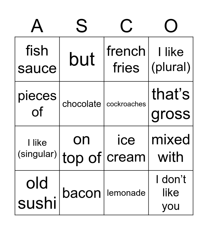 This bingo card has 22 words: bacon, bad breath, but, chicken, chocolate, cockroaches, fish sauce, french fries, ice cream, I don’t like you, I like (singular), I like (plural), I like it too, in, lemonade, milkshake, mixed with, old sushi, on top of, pieces of, that’s gross and with.