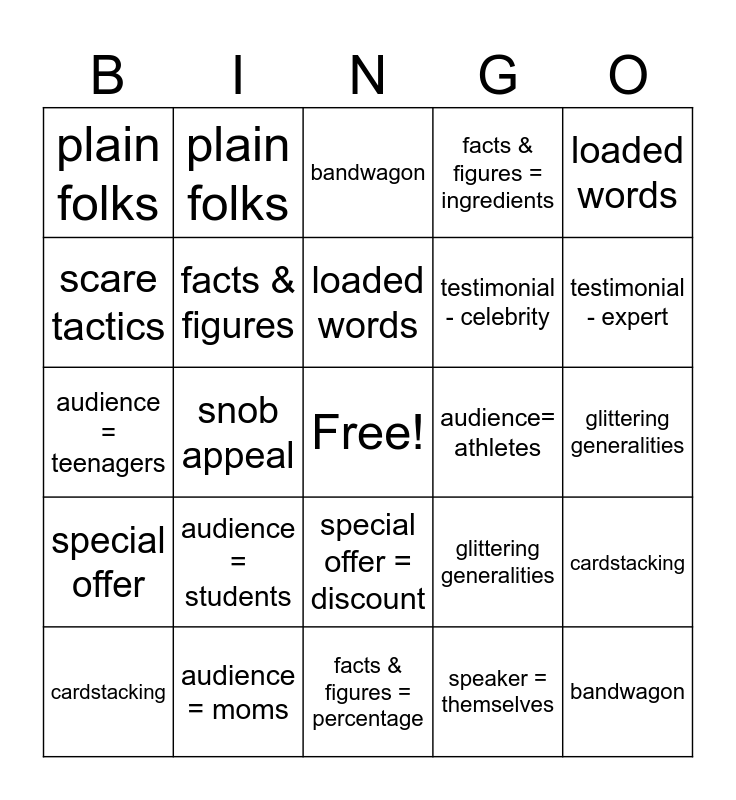 This bingo card has a free space and 26 words: special offer = discount, speaker = themselves, loaded words, audience = moms, loaded words, plain folks, scare tactics, plain folks, glittering generalities, glittering generalities, testimonial - celebrity, audience = teenagers, cardstacking, cardstacking, snob appeal, speaker=celebrity, facts & figures = ingredients, special offer, bandwagon, bandwagon, testimonial - expert, facts & figures = percentage, audience= athletes, audience = students, facts & figures and facts & figures.