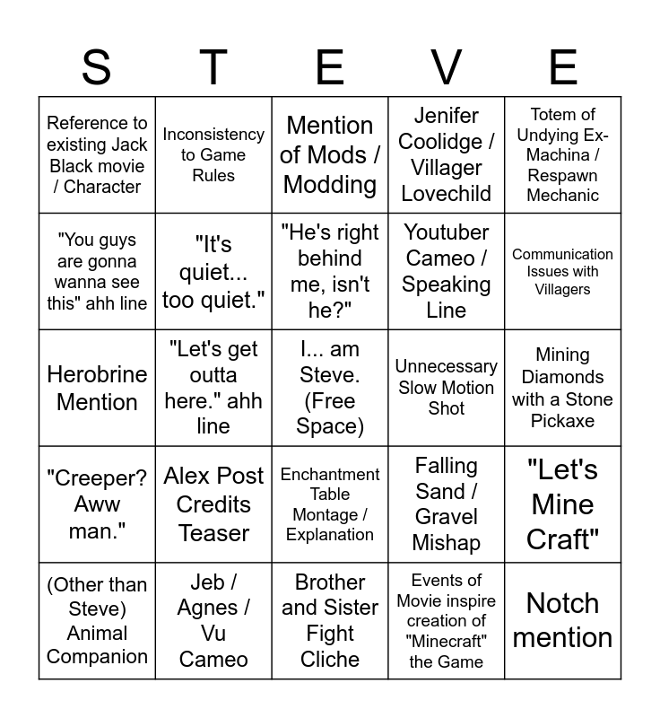This bingo card has a free space and 24 words: Alex Post Credits Teaser, Jeb / Agnes / Vu Cameo, "He's right behind me, isn't he?", (Other than Steve) Animal Companion, Totem of Undying Ex-Machina / Respawn Mechanic, Reference to existing Jack Black movie / Character, "You guys are gonna wanna see this" ahh line, Inconsistency to Game Rules, Unnecessary Slow Motion Shot, Enchantment Table Montage / Explanation, Youtuber Cameo / Speaking Line, Herobrine Mention, Falling Sand / Gravel Mishap, "Let's Mine Craft", "It's quiet... too quiet.", Events of Movie inspire creation of "Minecraft" the Game, Mining Diamonds with a Stone Pickaxe, Mention of Mods / Modding, Communication Issues with Villagers, "Let's get outta here." ahh line, Notch mention, "Creeper? Aww man.", Jenifer Coolidge / Villager Lovechild and Brother and Sister Fight Cliche.