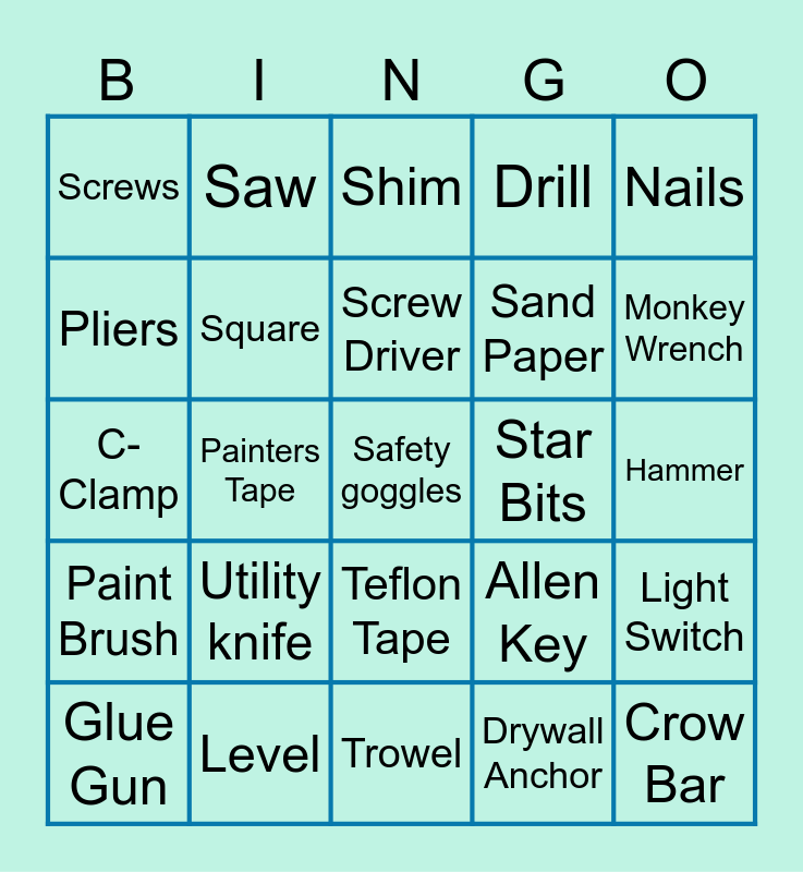 This bingo card has a free space and 24 words: Utility knife, Level, Screw Driver, Glue Gun, Nails, Screws, Pliers, Saw, Star Bits, Teflon Tape, Sand Paper, C-Clamp, Allen Key, Light Switch, Square, Drywall Anchor, Hammer, Shim, Monkey Wrench, Painters Tape, Crow Bar, Paint Brush, Drill and Trowel.