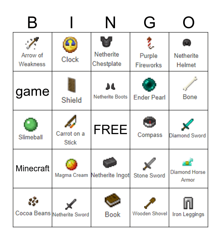 This bingo card has 22 images, a free space and 2 words: game and Minecraft.