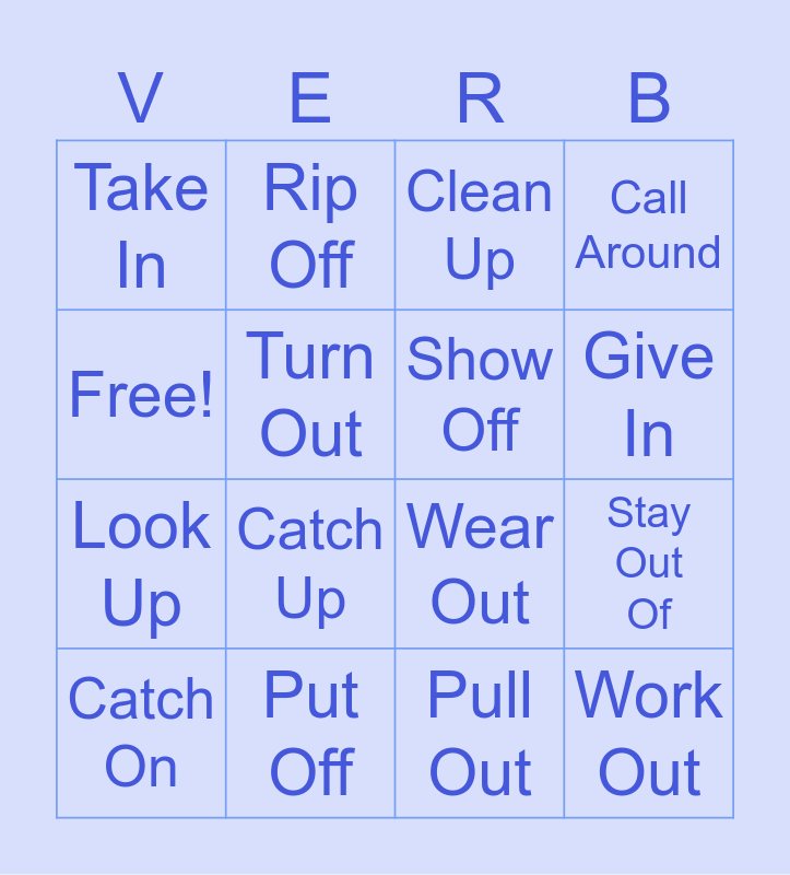 This bingo card has 16 words: Put Off, Stay Out Of, Clean Up, Take In, Look Up, Rip Off, Wear Out, Pull Out, Free!, Turn Out, Catch On, Call Around, Catch Up, Give In, Show Off and Work Out.