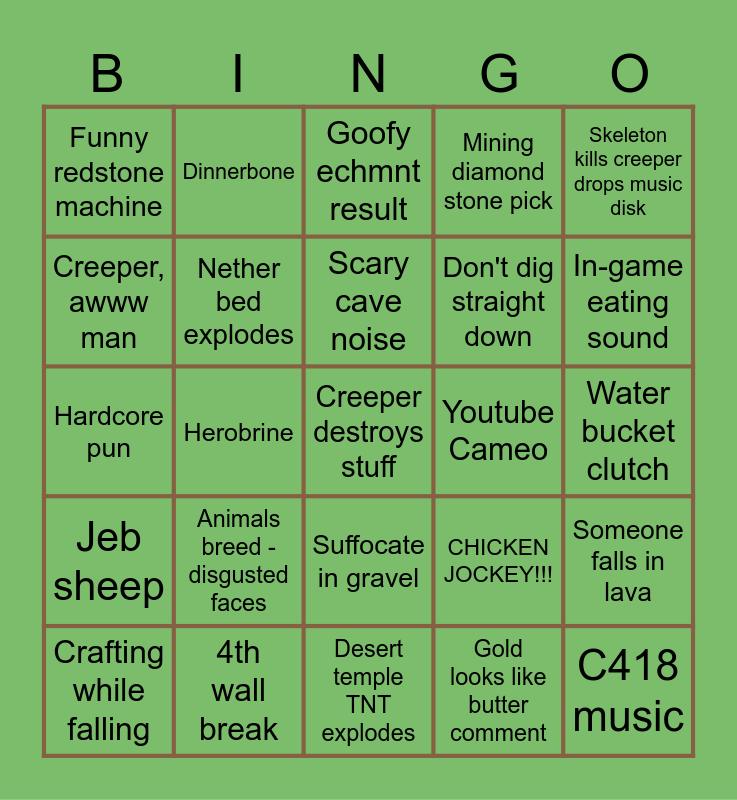 This bingo card has 25 words: Animals breed - disgusted faces, Desert temple TNT explodes, Scary cave noise, Crafting while falling, Skeleton kills creeper drops music disk, Funny redstone machine, Creeper, awww man, Dinnerbone, Youtube Cameo, Suffocate in gravel, Don't dig straight down, Hardcore pun, CHICKEN JOCKEY!!!, Someone falls in lava, Nether bed explodes, C418 music, Water bucket clutch, Goofy echmnt result, In-game eating sound, Herobrine, Creeper destroys stuff, 4th wall break, Jeb sheep, Mining diamond stone pick and Gold looks like butter comment.