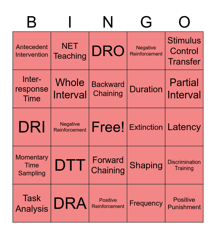 This bingo card has a free space and 24 words: DTT, DRA, Backward Chaining, Task Analysis, Stimulus Control Transfer, Antecedent Intervention, Inter-response Time, NET Teaching, Extinction, Forward Chaining, Duration, DRI, Shaping, Discrimination Training, Whole Interval, Frequency, Latency, DRO, Partial Interval, Negative Reinforcement, Positive Punishment, Momentary Time Sampling, Negative Reinforcement and Positive Reinforcement.