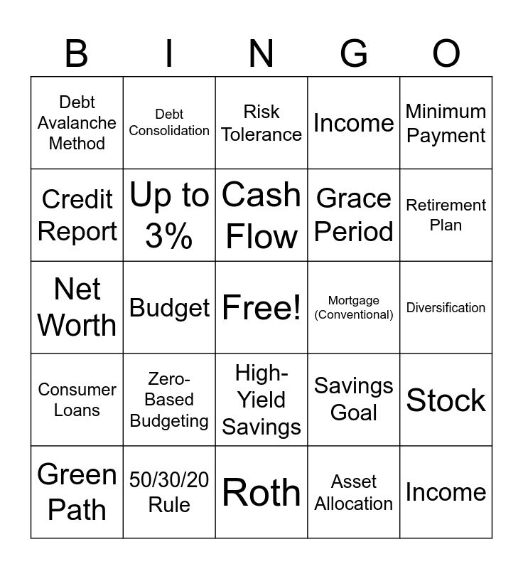 This bingo card has a free space and 24 words: Zero- Based Budgeting, 50/30/20 Rule, Cash Flow, Green Path, Minimum Payment, Debt Avalanche Method, Credit Report, Debt Consolidation, Mortgage (Conventional), High-Yield Savings, Grace Period, Net Worth, Savings Goal, Stock, Up to 3%, Asset Allocation, Diversification, Risk Tolerance, Retirement Plan, Budget, Income, Consumer Loans, Income and Roth.