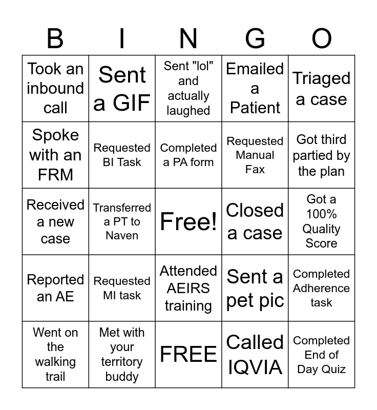 This bingo card has a free space and 25 words: Went on the walking trail, Requested MI task, Completed a PA form, Called IQVIA, Got third partied by the plan, Took an inbound call, Sent a GIF, Sent "lol" and actually laughed, Requested Manual Fax, Completed Adherence task, Received a new case, Requested BI Task, Sent a pet pic, Completed End of Day Quiz, Spoke with an FRM, Met with your territory buddy, FREE, Emailed a Patient, Got a 100% Quality Score, Reported an AE, Transferred a PT to Naven, Attended AEIRS training, Closed a case, Triaged a case and Transferred a PT to their SP.