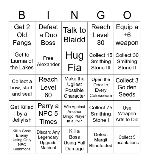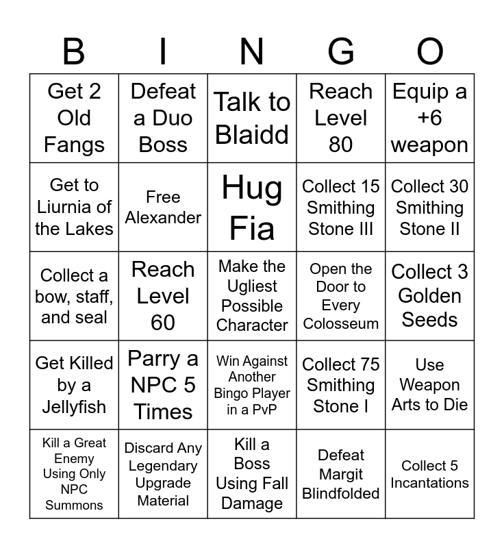 This bingo card has a free space and 76 words: Defeat a non-tutorial boss with only jump attacks, Use 5 swordstone keys, Talk to Blaidd, Defeat 2 bosses with a NPC summon, Mix your Physick flask with 2 tears, Collect a Haligtree Medallion half, Clear an Evergoal, Collect 5 spells, Defeat Radhann, Have 150k runes on you, Beat a non-tutorial boss with a weapon with not your stats, Die to a Dog, Hug Fia, Get to Liurnia of the Lakes, Reach Castle Morne, Reach Level 60, Collect 4 Physick Tears, Collect 5 Incantations, Equip a +9 weapon, Equip a +6 weapon, Visit 6 regions, Collect a bow, staff, and seal, Free Alexander, Defeat a Duo Boss, Reach Level 80, Visit Mount Gelmir, Kill 30 Sheep, Kill 45 Deers, Collect 50 Herba, Collect 50 Mushrooms, Collect 25 Bloodroses, Collect 15 Miquella's Lillys, Collect 500 Ruin Fragments, Collect 75 Smithing Stone I, Collect 30 Smithing Stone II, Collect 15 Smithing Stone III, Collect 10 Smithing Stone IV, Collect 5 Smithing Stone V, Collect 3 Golden Seeds, Defeat Margit Blindfolded, Get Grafted Dragon, Get Bolt of Gransax, Have 300K Runes on You, Defeat Ancestor Spirit No Hit, Defeat Rennala Naked, Complete Dung Eater's Questline, Kill a Great Enemy Using Only NPC Summons, Get 2 Old Fangs, Collect 15 Crab Eggs, Collect 10 Land Octopus Ovarys, Get a Greenburst Crystal Tear, Win Against Another Bingo Player in a PvP, Do 3 Successful Invasions, Do 5 Successful Invasions, Do 7 Successful Invasions, Kill a Great Enemy Without Jumping Once, Kill Another Bingo Player Unsuspectfully In Any Way, Kill 3 Commoners, Shoot Another Bingo Player With a Bow From Minimum 15 Feet, Shoot Yourself With a Bow, Parry a NPC 5 Times, Get Killed by Waterfowl Dance, Die with a Rune Arc Active, Die in Every Castle on the Map, Acquire 10 Cracked Pots, Take a Shower and Use Soap, Open the Door to Every Colosseum, Use Bloodhound Step to die, Obtain a Somber Ancient Dragon Smithing Stone, Get Hit by a Scarab's Explosion, Use Weapon Arts to Die, Get Killed by a Jellyfish, Discard Any Legendary Upgrade Material, Complete 2 Catacomb Dungeons, Kill a Boss Using Fall Damage and Get 2 Great Runes.