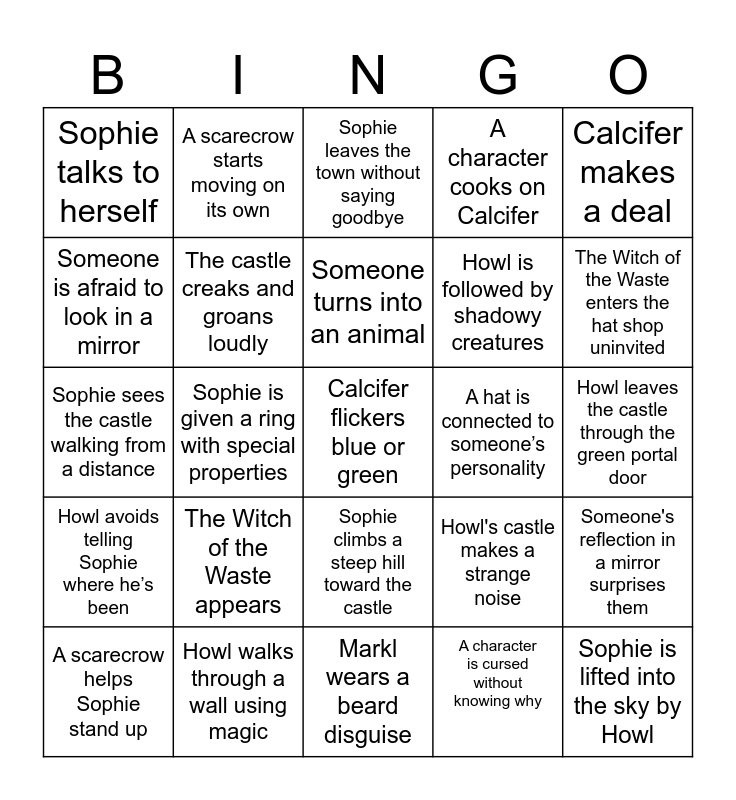 This bingo card has 50 words: Howl uses magic to disappear, Calcifer flickers blue or green, Sophie lies about her age, Markl wears a beard disguise, The Witch of the Waste appears, A ring glows without being touched, A scarecrow starts moving on its own, Calcifer grumbles, Someone is afraid to look in a mirror, A walking stick is used, The castle creaks and groans loudly, A character cooks on Calcifer, Someone's reflection in a mirror surprises them, Howl's castle makes a strange noise, A character warns Sophie not to trust magic, A castle door changes color, Someone turns into an animal, A hat is connected to someone’s personality, A character walks through a field of flowers, Calcifer makes a deal, Sophie is given a ring with special properties, A character is cursed without knowing why, Sophie talks to herself, Howl is followed by shadowy creatures, A castle moves through the mountains, Sophie is lifted into the sky by Howl, The Witch of the Waste enters the hat shop uninvited, Sophie is transformed by a curse, Sophie leaves the town without saying goodbye, Sophie climbs a steep hill toward the castle, Sophie knocks on the castle door and no one answers at first, Markl opens the door pretending to be someone else, Calcifer refuses to obey Sophie’s order, Sophie makes breakfast for everyone in the castle, Howl walks through a wall using magic, The castle door opens into a busy city, Markl turns the door dial before opening it, Sophie offers to clean the castle, Sophie makes a deal with Calcifer about breaking each other’s curses, Howl leaves the castle through the green portal door, The castle is shown walking across the countryside for the first time, Sophie falls asleep in front of Calcifer, Sophie tells Howl she’s his new cleaning lady, Howl rescues Sophie from soldiers in the alley, A scarecrow helps Sophie stand up, Sophie sees the castle walking from a distance, Calcifer asks Sophie to guess his secret, Markl gets nervous when Sophie asks questions, Howl avoids telling Sophie where he’s been and Sophie finds a strange, magical mess in Howl’s bathroom.