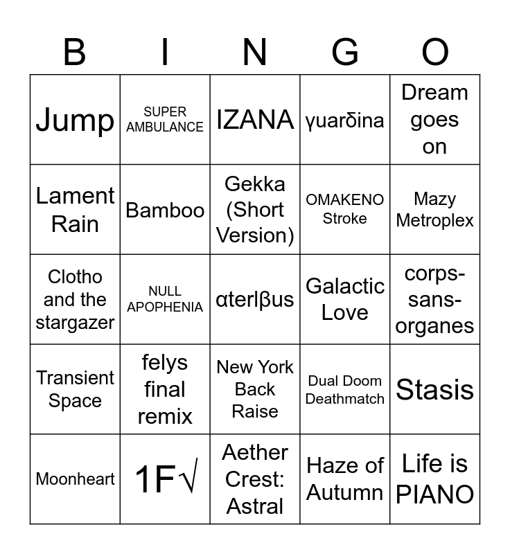 This bingo card has 451 words: Blossoms, Fairytale, Sayonara Hatsukoi, Heartache, Hidden Rainbows of Epicurus, HELLOHELL, Brand new world, Clotho and the stargazer, Death by Glamour, Dream goes on, First Snow, Infinity Heaven, inkar-usi, Jingle, Moonlight of Sand Castle, Paradise, Rise, Romance Wars, Suomi, Dement ~after legend~, Prism, world.execute(me);, Relentless, Bullet Waiting for Me (James Landino remix), Diode, I've heard it said, Hikari, 1F√, blue comet, Last Goodbye, One Last Drive, Prayer, Genesis (Iris), Hall of Mirrors, LiftOff, Lucifer, Ävril -Flicka i krans-, Dot to Dot feat. shully, Oblivia, san skia, Shades of Light in a Transcendent Realm, Bookmaker (2D Version), Tie me down gently, FURETE-MITAI, INTERNET OVERDOSE, Lumia, Moonheart, REconstruction, Snow White, Eccentric Tale, Purgatorium, Rabbit In The Black Room, Altair (feat. *spiLa*), Babaroque, Dandelion, DDD, Harutopia ~Utopia of Spring~, Innocence, Reinvent, syūten, April showers, enchanted love, epitaxy, Gekka (Short Version), Black Mirror on the Wall, FREEF4LL, Silent Rush, Beside You, Call My Name feat. Yukacco, Grimheart, Paper Witch, Senkyou, WAIT FOR DAWN, cry of viyella, Gensou no Satellite, IONOSTREAM, Quon (WACCA), Tsuki ni Murakumo, Hana ni Kaze, Cosmo Pop Funclub, CYCLES, Dialnote, MORNINGLOOM, next to you, Solitary Dream, Shinchoku Doudesuka?, Surrender, Vivid Theory, Waltz for Lorelei, Antithese, BREaK! BREaK! BREaK!, Cosmica, Crimson Quartz, Saint or Sinner, BlazinG AIR, Chelsea, Evoltex (poppi'n mix), Flashback, Lights of Muse, Maze No.9, memoryfactory.lzh, MERLIN, Chronostasis, Dual Doom Deathmatch, Give Me a Nightmare, Hypnotize, Your Best Nightmare, Flyburg and Endroll, Galactic Love, Jump, Kanagawa Cyber Culvert, Primeval Texture, Turbocharger, Lawless Point, Last, Alice's Suitcase, Blue Rose, Coastal Highway, Empire of Winter, Faint Light (Arcaea Edit), Journey, Life is PIANO, dropdead, Essence of Twilight, Iconoclast, La'qryma of the Wasteland, qualia -ideaesthesia-, ReviXy, Alice à la mode, cocoro*cosmetic, Dancin' on a Cat's Paw, Libertas, Phantasia, Sign of "10.5km", Used to be, Anökumene, Leave All Behind, Lost Civilization, Rugie, Strongholds, Auxesia, Can I Friend You on Bassbook? Lol, Feels So Right feat. Renko, Floating World, GOODTEK (Arcaea Edit), Lost Emotion feat. nomico, Small Cloud Sugar Candy, Syro, The Formula, Blaster, Blocked Library, Don't Fight The Music, False Embellishment, Glow, Ignotus, Oracle, STARGATE EXTREME, AI[UE]OON, Be There, Dreamin' Attraction!!, DRG, Equilibrium, FANTA5Y, Impure Bird, Lapis, Let you DIVE! (nitro rmx), Party Vinyl, Redraw the Colorless World, Sakura Fubuki, Specta, with U, Yosakura Fubuki, Your voice so... feat. Such, CROSS†OVER, CROSS†SOUL, Crystal Gravity, Final Step!, Head BONK ache, lastendconductor, MANTIS (Arcaea Ultra-Bloodrush VIP), PICO-Pico-Translation!, Raven's Pride, Red and Blue, Teriqma, Third Sun, VECTOЯ, 〇、, Inverted World, MAHOROBA, On And On!! feat. Jenga, STAGER (ALL STAGE CLEAR), 8-EM, astral.exe, Cybernecia Catharsis, DataErr0r, Dies irae, Dynitikós, Evening in Scarlet, felys final remix, GIMMICK, Illegal Paradise, In Vain, MEGALOVANIA, NULCTRL, OMAKENO Stroke, Rain of Conflict in a Radiant Abyss, Straight into the lights, Transient Space, Twilight Concerto, ΟΔΥΣΣΕΙΑ, A Wandering Melody of Love, Alone & Lorn, Heart, IMPACT, Lazy Addiction, Quon (Lanota), Remind the Souls (Short Version), Vindication, Astral tale, Avant Raze, carmine:scythe, Distorted Fate, ENERGY SYNERGY MATRIX, LunarOrbit -believe in the Espebranch road-, Purple Verse, Stratoliner, Renegade, AlterAle, DX Choseinou Full Metal Shojo, Filament, Hailstone, Heart Jackin', Hotarubi no Yuki, Sulfur, The Message, µ, amygdata, Awaken In Ruins, B.B.K.K.B.K.K., BADTEK, BATTLE NO.1, Black Lotus, BLRINK, Dazzle hop, Dreadnought, Fallensquare, goldenslaughterer, Let's Rock (Arcaea mix), Lethaeus, Lost in the Abyss, Luna Rossa, Monochrome Princess, nέo κósmo, SACRIFICE feat. ayame, SUPERNOVA, Vandalism, Loveless Dress, Rays of Remnant, Altale, Ascent, Defection, Far Away Light, FLUFFY FLASH, Got hive of Ra, Haze of Autumn, Heavenly caress, Ignition, Linear Accelerator, Macrocosmic Modulation, Mazy Metroplex, Memory Forest, RGB, shrink, Technicolour, World Fragments III (radio edit), Xeraphinite, yomibito_shirazu, 10pt8ion, Ai Drew, Black Territory, Corruption, Einherjar Joker, Genesis (CHUNITHM), Hybris (The one who shattered), HYPER VISION, init(), Kanjou no Matenrou ~Arr.Demetori, LIVHT MY WΔY, Lost Desire, MEGALOVANIA (Camellia Remix), Nameless Passion, Old School Salvage, Ouvertüre, Protoflicker, Scarlet Cage, SOUNDWiTCH, THE ULTIMACY, Callima Karma, To the Furthest Dream, Amekagura, Arcahv, Beautiful Dreamer, Désive, Modelista, Summer Fireworks of Love, Ultimate taste, ViRTUS, 7thSense, Antagonism, Ashen 6oundary, Astra walkthrough, Devillic Sphere, Distortion Human, Galaxy Friends, Heavensdoor, Infinite Strife,, INTERNET YAMERO, MAXRAGE, Mirzam, New York Back Raise, Nhelv, The Survivor (Game Edit), Trap Crow, trappola bewitching, Swan Song, Bamboo, Chromafill, Free Myself, Oshama Scramble!, Scarlet Lance, TRPNO, World Ender, Alexandrite, HIVEMIND, Masquerade Legion, Sheriruth, Vicious Heroism, Xanatos, Kanbu de Tomatte Sugu Tokeru, PRAGMATISM, G e n g a o z o, Medusa, Trrricksters!!, Capella, Magnolia, Nirv lucE, conflict, Logos, Löschen, Malicious Mischance, NEO WINGS, Redolent Shape, Valhalla:0, αterlβus, Ether Strike, IZANA, SUPER AMBULANCE, 99 Glooms, Hiiro Gekka, Kyoushou no Zetsu (nayuta 2017 ver.), Ikazuchi, Metallic Punisher, Tiferet, To: Alice Liddell, ultradiaxon-N3, Viyella's Tears, Breach of Faith, Felis, MIRINAE, Placebo♥Battler, To the Milky Way, γuarδina, Climax, Garakuta Doll Play, Kissing Lucifer, Last Celebration, Lethal Voltage, Pentiment, PUPA, Qovat, Chronicle, GLORY:ROAD, Halcyon, Lightning Screw, Rise of the World, Wish Upon a Snow, Aleph-0, ALTER EGO, Arcana Eden, Aurgelmir, eden, Ego Eimi, GIMME DA BLOO