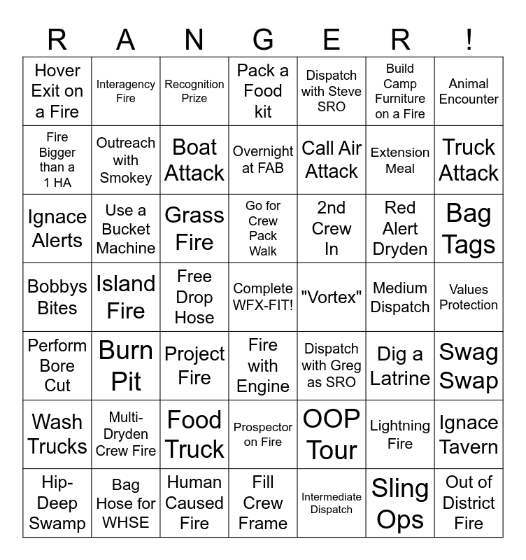 This bingo card has a free space and 48 words: Perform Bore Cut, Island Fire, Human Caused Fire, Fire with Engine, Call Air Attack, Medium Dispatch, Animal Encounter, Hip-Deep Swamp, Use a Bucket Machine, Free Drop Hose, Pack a Food kit, Dispatch with Steve SRO, Red Alert Dryden, Bag Tags, Bobbys Bites, Multi-Dryden Crew Fire, Recognition Prize, Go for Crew Pack Walk, OOP Tour, Build Camp Furniture on a Fire, Truck Attack, Fire Bigger than a 1 HA, Interagency Fire, Boat Attack, Intermediate Dispatch, Extension Meal, Values Protection, Wash Trucks, Burn Pit, Grass Fire, Prospector on Fire, 2nd Crew In, Lightning Fire, Ignace Tavern, Hover Exit on a Fire, Bag Hose for WHSE, Project Fire, Fill Crew Frame, "Vortex", Sling Ops, Swag Swap, Ignace Alerts, Outreach with Smokey, Food Truck, Overnight at FAB, Dispatch with Greg as SRO, Dig a Latrine and Out of District Fire.