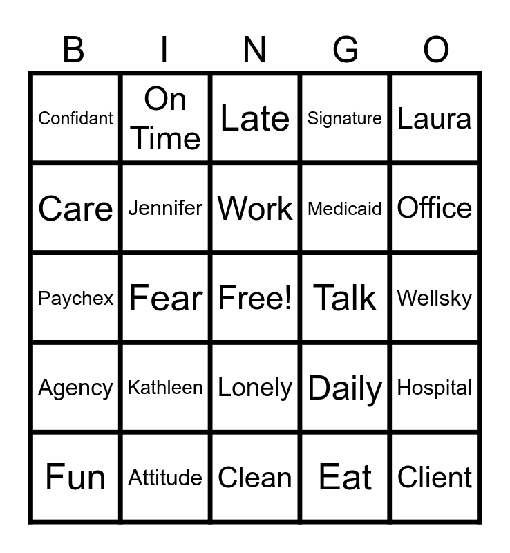 This bingo card has a free space and 24 words: Kathleen, Attitude, Work, Fun, Laura, Confidant, Care, On Time, Talk, Lonely, Medicaid, Paychex, Daily, Hospital, Jennifer, Eat, Wellsky, Late, Office, Fear, Client, Agency, Signature and Clean.