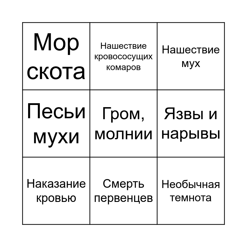 This bingo card has 9 words: Наказание кровью, Нашествие мух, Нашествие кровососущих комаров, Песьи мухи, Мор скота, Язвы и нарывы, Гром, молнии, Необычная темнота and Смерть первенцев.