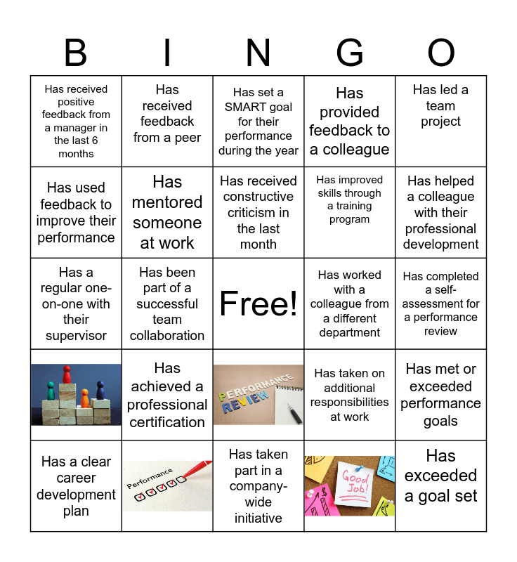 This bingo card has 4 images, a free space and 20 words: Has achieved a professional certification, Has received constructive criticism in the last month, Has a clear career development plan, Has led a team project, Has received positive feedback from a manager in the last 6 months, Has used feedback to improve their performance, Has received feedback from a peer, Has worked with a colleague from a different department, Has improved skills through a training program, Has a regular one-on-one with their supervisor, Has taken on additional responsibilities at work, Has met or exceeded performance goals, Has mentored someone at work, Has completed a self-assessment for a performance review, Has set a SMART goal for their performance during the year, Has helped a colleague with their professional development, Has been part of a successful team collaboration, Has exceeded a goal set, Has provided feedback to a colleague and Has taken part in a company-wide initiative.