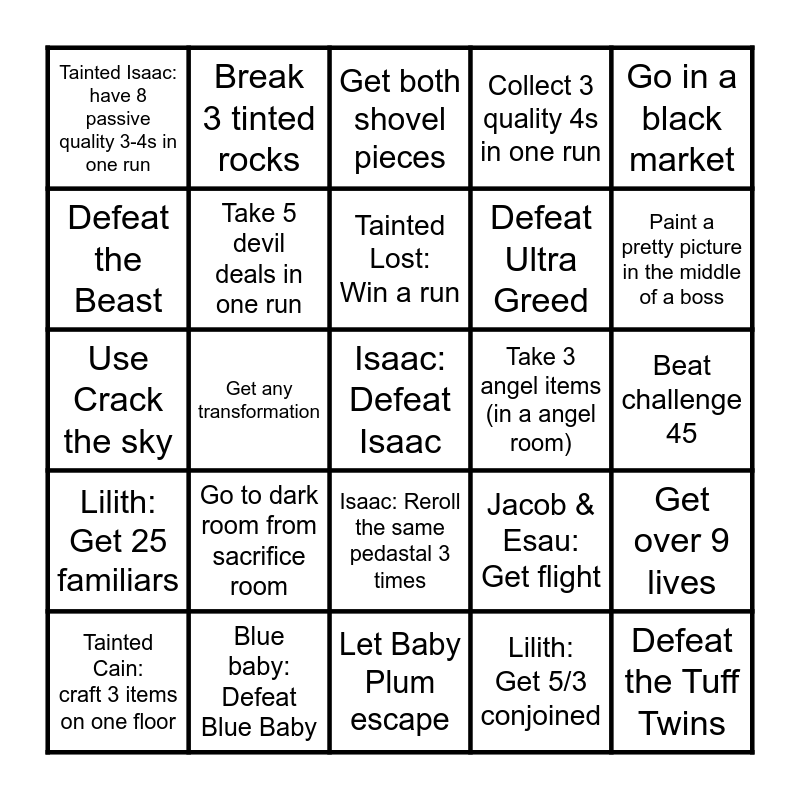This bingo card has 55 words: Sell out any kind of Begger, Get any transformation, Skip 2 quality 4s in one run, Collect 3 quality 4s in one run, Max out speed stat, Get 15 luck, Take 5 devil deals in one run, Sleep in a bed, Take 3 angel items (in a angel room), Get both key peices and knife peices in one run, Defeat the Beast, Defeat Mother, Isaac: Reroll the same pedastal 3 times, Defeat Delirium, Get 12 health containers in one run, Get 12 soul/black hearts at the same time in one run, Break 3 tinted rocks, Get both shovel pieces, The Lost: Defeat Mom, Beat challenge 45, Tainted Cain: craft 3 items on one floor, Blue baby: Defeat Blue Baby, Isaac: Defeat Isaac, Defeat Ultra Greed, Tainted Isaac: have 8 passive quality 0-2s in one run, Use Crack the sky, Go to dark room from sacrifice room, Sell out any kind of machine (blood, money, etc.), Jacob & Esau: Get flight, Defeat the Tuff Twins, Get a Planetarium, Get an Item from a chest, Get No.1 and No.2 in one run, Go in a crawlspace, Go in a black market, Lilith: Get 25 familiars, Azazel: Get under 2 damage, Tainted Lost: Win a run, Beat a run with under 1 speed, Get over 60 damage, Tainted Isaac: have 8 passive quality 3-4s in one run, Normal/Hard: Get 99 coins, Forgotten: Win with over 15 range, Tainted Bethany: get max whisps, Get over 9 lives, Magdalene: Have 0 heart containers, Beat the G-FUEL seed, Let Baby Plum escape, Tainted Blue baby: win a run, Paint a pretty picture in the middle of a boss, Tainted/normal Apollyon: Win a run with no items, Win the Daily Challenge, Tainted keeper: Have no coins at the end of a run, Lilith: Get 5/3 conjoined and Use the R key item.