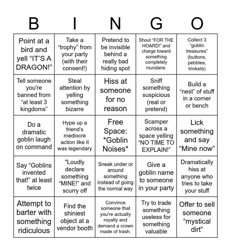 This bingo card has a free space and 24 words: "Loudly declare something “MINE!” and scurry off, Find the shiniest object at a vendor booth, Hiss at someone for no reason, Attempt to barter with something ridiculous, Collect 3 “goblin treasures” (buttons, pebbles, trinkets), Point at a bird and yell “IT’S A DRAGON!”, Tell someone you're banned from “at least 3 kingdoms”, Take a “trophy” from your party (with their consent!), Scamper across a space yelling “NO TIME TO EXPLAIN!”, Sneak under or around something instead of going the normal way, Sniff something suspicious (real or pretend), Do a dramatic goblin laugh on command, Give a goblin name to someone in your party, Dramatically hiss at anyone who tries to take your stuff, Steal attention by yelling something bizarre, Try to trade something useless for something valuable, Lick something and say “Mine now”, Pretend to be invisible behind a really bad hiding spot, Build a “nest” of stuff in a corner or bench, Hype up a friend’s mediocre action like it was legendary, Offer to sell someone “mystical dirt”, Say “Goblins invented that!” at least twice, Shout “FOR THE HOARD!” and charge toward something completely mundane. and Convince someone that you're actually royalty and demand a crown made of trash..