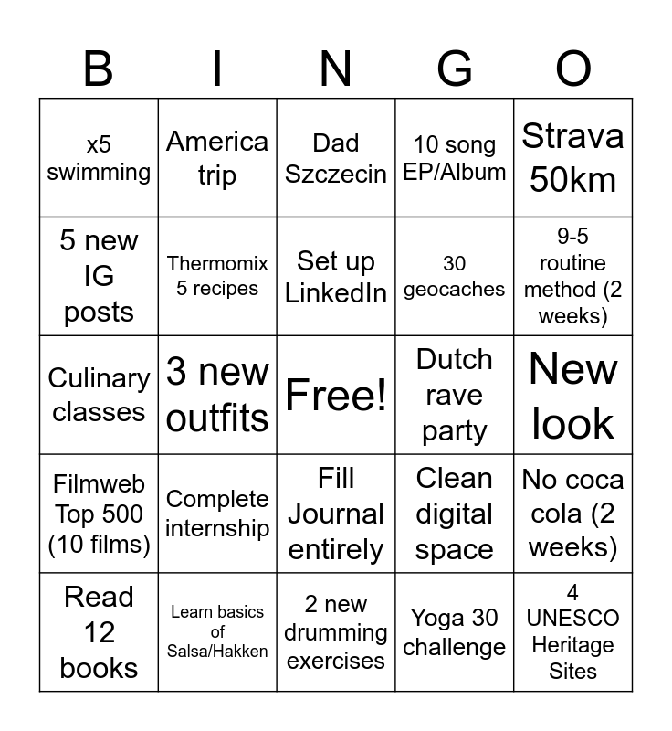 This bingo card has a free space and 24 words: Read 12 books, Complete internship, Set up LinkedIn, Yoga 30 challenge, Strava 50km, x5 swimming, America trip, Dad Szczecin, Dutch rave party, New look, Culinary classes, Thermomix 5 recipes, Clean digital space, No coca cola (2 weeks), 5 new IG posts, Learn basics of Salsa/Hakken, 2 new drumming exercises, 10 song EP/Album, 9-5 routine method (2 weeks), Filmweb Top 500 (10 films), 3 new outfits, Fill Journal entirely, 30 geocaches and 4 UNESCO Heritage Sites.