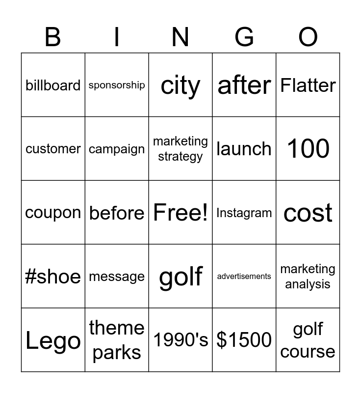 This bingo card has a free space and 24 words: message, theme parks, marketing strategy, Lego, Flatter, billboard, customer, sponsorship, Instagram, golf, launch, coupon, advertisements, marketing analysis, campaign, $1500, cost, city, 100, before, golf course, #shoe, after and 1990's.