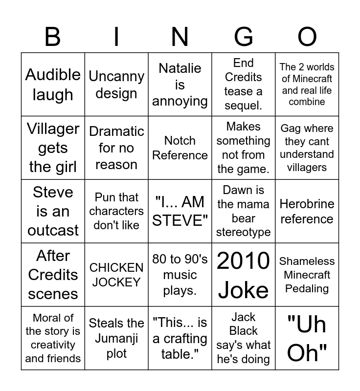 This bingo card has a free space and 24 words: CHICKEN JOCKEY, Steals the Jumanji plot, Notch Reference, Moral of the story is creativity and friends, The 2 worlds of Minecraft and real life combine, Audible laugh, Villager gets the girl, Uncanny design, Dawn is the mama bear stereotype, 80 to 90's music plays., Makes something not from the game., Steve is an outcast, 2010 Joke, Shameless Minecraft Pedaling, Dramatic for no reason, Jack Black say's what he's doing, Herobrine reference, Natalie is annoying, Gag where they cant understand villagers, Pun that characters don't like, "Uh Oh", After Credits scenes, End Credits tease a sequel. and "This... is a crafting table.".