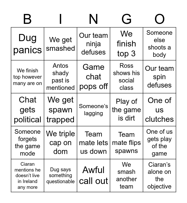 This bingo card has a free space and 24 words: We triple cap on dom, Dug says something questionable, Game chat pops off, Ciaran mentions he doesn’t live in Ireland any more, Someone else shoots a body, Dug panics, We finish top however many are on, We get smashed, Play of the game is dirt, Team mate lets us down, Ross shows his social class, Chat gets political, Team mate flips spawns, One of us gets play of the game, Antos shady past is mentioned, We smash another team, One of us clutches, Our team ninja defuses, Our team spin defuses, We get spawn trapped, Ciaran’s alone on the objective, Someone forgets the game mode, We finish top 3 and Awful call out.