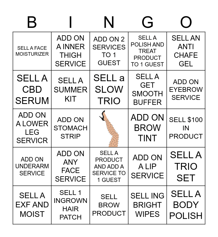 This bingo card has a free space and 24 words: ADD ON ANY FACE SERVICE, SELL 1 INGROWN HAIR PATCH, SELL a SLOW TRIO, SELL A EXF AND MOIST, SELL AN ANTI CHAFE GEL, SELL A FACE MOISTURIZER, SELL A CBD SERUM, ADD ON A INNER THIGH SERVICE, ADD ON BROW TINT, SELL A PRODUCT AND ADD A SERVICE TO 1 GUEST, SELL A GET SMOOTH BUFFER, ADD ON A LOWER LEG SERVICR, ADD ON A LIP SERVICE, SELL A TRIO SET, SELL A SUMMER KIT, SELL ING BRIGHT WIPES, SELL $100 IN PRODUCT, ADD ON 2 SERVICES TO 1 GUEST, ADD ON EYEBROW SERVICE, ADD ON STOMACH STRIP, SELL A BODY POLISH, ADD ON UNDERARM SERVICE, SELL A POLISH AND TREAT PRODUCT TO 1 GUEST and SELL BROW PRODUCT.