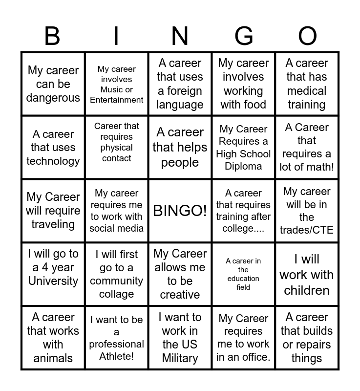 This bingo card has a free space and 24 words: A career that works with animals, I will first go to a community collage, A career that helps people, My Career requires me to work in an office., A career that has medical training, My career can be dangerous, My career involves Music or Entertainment, A career that uses a foreign language, A career that requires training after college...., My career will be in the trades/CTE, My Career will require traveling, Career that requires physical contact, A career in the education field, I will work with children, A career that uses technology, I want to be a professional Athlete!, I want to work in the US Military, My career involves working with food, A Career that requires a lot of math!, I will go to a 4 year University, My career requires me to work with social media, My Career allows me to be creative, My Career Requires a High School Diploma and A career that builds or repairs things.