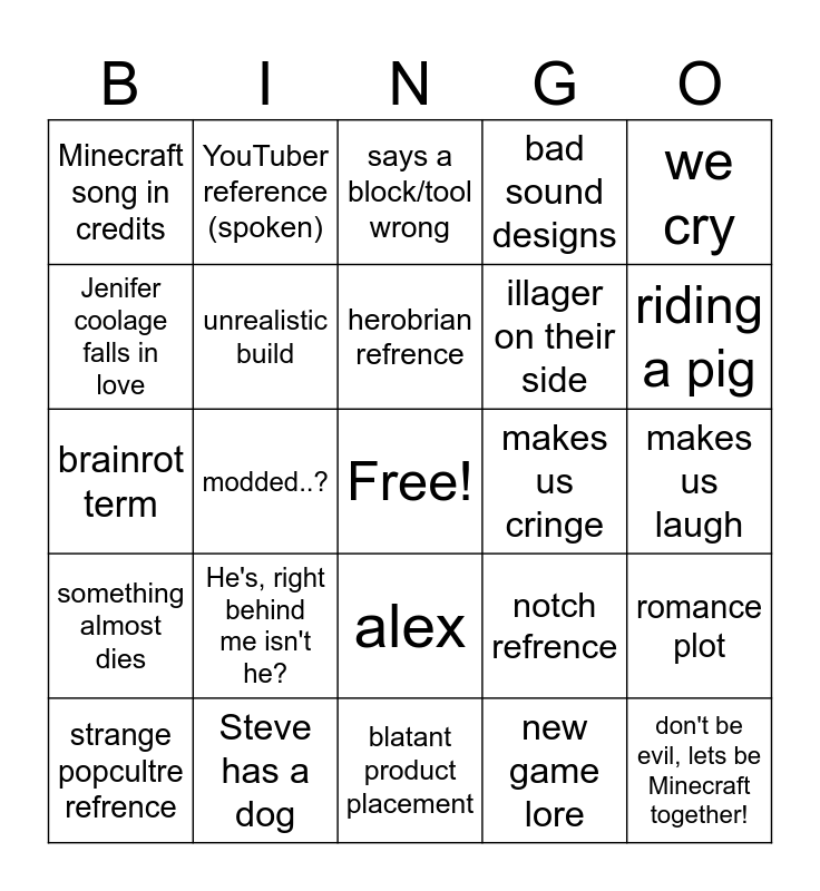 This bingo card has a free space and 24 words: He's, right behind me isn't he?, Steve has a dog, herobrian refrence, strange popcultre refrence, we cry, Minecraft song in credits, Jenifer coolage falls in love, YouTuber reference (spoken), makes us cringe, alex, illager on their side, brainrot term, notch refrence, romance plot, unrealistic build, new game lore, makes us laugh, says a block/tool wrong, riding a pig, modded..?, don't be evil, lets be Minecraft together!, something almost dies, bad sound designs and blatant product placement.