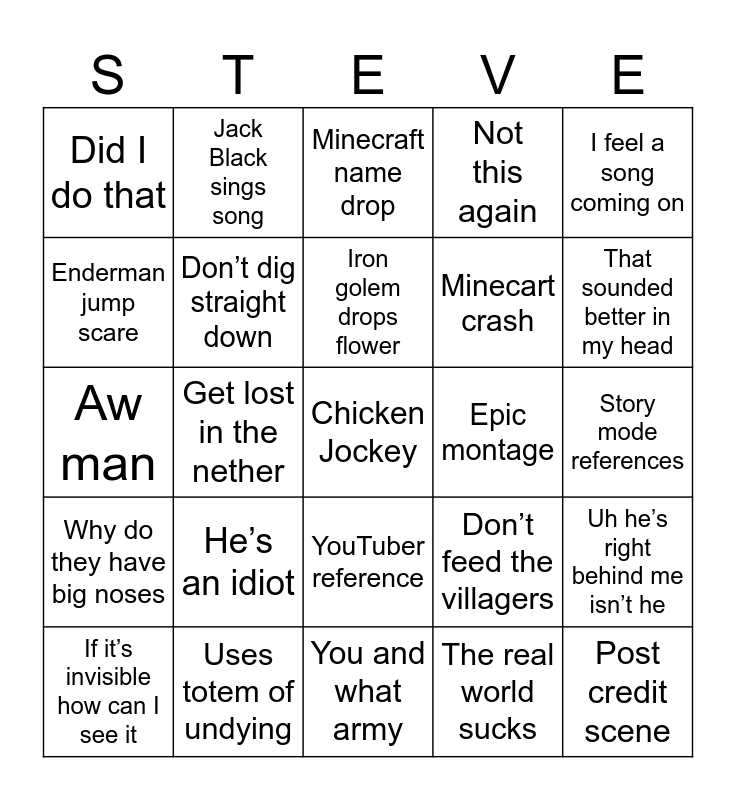 This bingo card has a free space and 24 words: He’s an idiot, Uses totem of undying, Iron golem drops flower, If it’s invisible how can I see it, I feel a song coming on, Did I do that, Enderman jump scare, Jack Black sings song, Epic montage, YouTuber reference, Minecart crash, Aw man, Don’t feed the villagers, Uh he’s right behind me isn’t he, Don’t dig straight down, The real world sucks, Story mode references, Minecraft name drop, That sounded better in my head, Get lost in the nether, Post credit scene, Why do they have big noses, Not this again and You and what army.