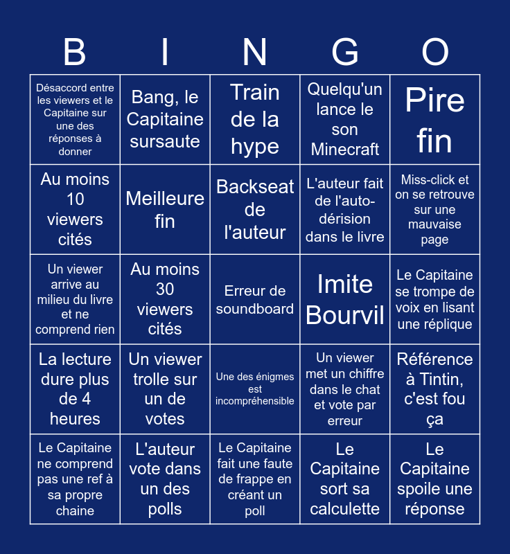 This bingo card has 34 words: Le Capitaine spoile une réponse, Le Capitaine sort sa calculette, Le quatrième mur s'effondre, La lecture dure moins de 4 heures, La lecture dure plus de 4 heures, Meilleure fin, Pire fin, Le Capitaine ne comprend pas une ref à sa propre chaine, Bang, le Capitaine sursaute, Au moins un 'monde' est perdu, Backseat de l'auteur, Train de la hype, Le Capitaine rit, Appel sur le téléphone du Capitaine, Imite Bourvil, Miss-click et on se retrouve sur une mauvaise page, L'auteur vote dans un des polls, Un viewer arrive au milieu du livre et ne comprend rien, Un viewer trolle sur un de votes, Un viewer met un chiffre dans le chat et vote par erreur, Une des énigmes est incompréhensible, Le Capitaine a des problèmes de costume, Désaccord entre les viewers et le Capitaine sur une des réponses à donner, Le Capitaine se trompe de voix en lisant une réplique, Le Capitaine fait une faute de frappe en créant un poll, Erreur de soundboard, Quelqu'un lance le son Minecraft, Chanson de Danxter, L'auteur fait de l'auto-dérision dans le livre, Au moins 10 viewers cités, Au moins 20 viewers cités, Au moins 30 viewers cités, Référence à Tintin, c'est fou ça and Un subgoal est validé.