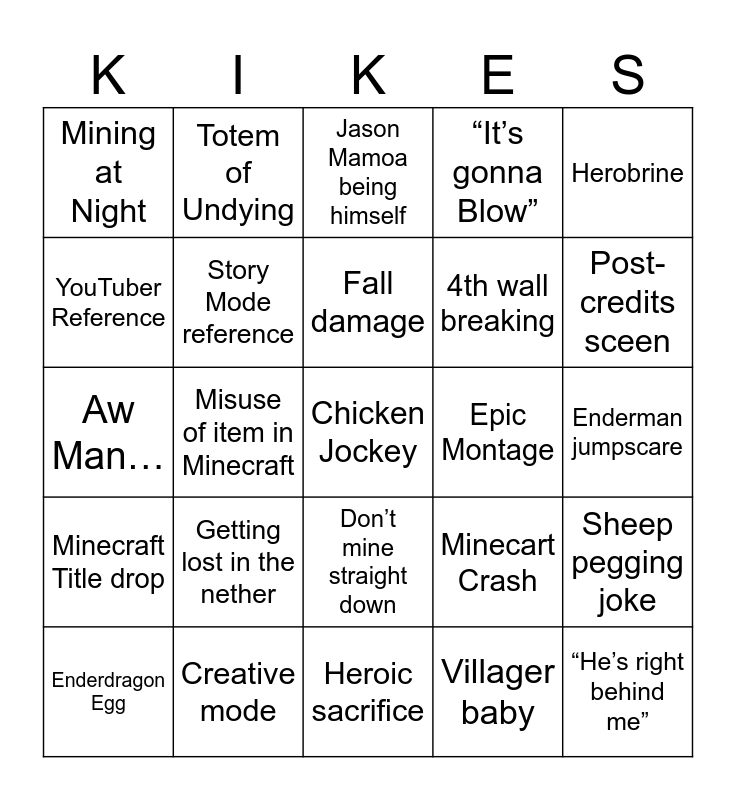 This bingo card has a free space and 24 words: Getting lost in the nether, Creative mode, Fall damage, Enderdragon Egg, Herobrine, Mining at Night, YouTuber Reference, Totem of Undying, Epic Montage, Don’t mine straight down, 4th wall breaking, Aw Man…, Minecart Crash, Sheep pegging joke, Story Mode reference, Villager baby, Enderman jumpscare, Jason Mamoa being himself, Post-credits sceen, Misuse of item in Minecraft, “He’s right behind me”, Minecraft Title drop, “It’s gonna Blow” and Heroic sacrifice.