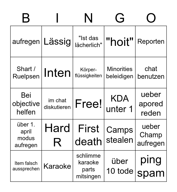 This bingo card has a free space and 24 words: Hard R, Karaoke, Körper-flüssigkeiten, Item falsch aussprechen, Reporten, aufregen, Shart / Ruelpsen, Lässig, KDA unter 1, First death, Minorities beleidigen, Bei objective helfen, Camps stealen, ueber Champ aufregen, Inten, über 10 tode, ueber apored reden, "Ist das lächerlich", chat benutzen, im chat diskutieren, ping spam, über 1. april modus aufregen, "hoit" and schlimme karaoke parts mitsingen.