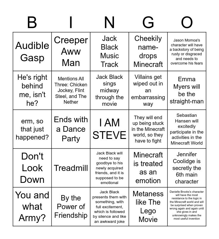 This bingo card has a free space and 24 words: You and what Army?, Treadmill, Jack Black sings midway through the movie, Metaness like The Lego Movie, Jason Momoa's character will have a backstory of being rusty or disgraced and needs to overcome his fears, Audible Gasp, Creeper Aww Man, Jack Black Music Track, They will end up being stuck in the Minecraft world, so they have to fight, Sebastian Hansen will excitedly participate in the activities in the Minecraft World, erm, so that just happened?, Mentions All Three: Chicken Jockey, Flint Steel, and The Nether, Minecraft is treated as an emotion, Jennifer Coolidge is secretly the 6th main character, He's right behind me, isn't he?, By the Power of Friendship, Jack Black presents them with something, with full excitement, which is followed by silence and like an awkward joke, Cheekily name-drops Minecraft, Emma Myers will be the straight-man, Don't Look Down, Ends with a Dance Party, Jack Black will need to say goodbye to his newly acquired friends, and it is supposed to be emotional, Villains get wiped out in an embarrassing way and Danielle Brooks's character will have the most resistance to the logic in the Minecraft world and will be surprised when proven wrong again and again until she gives in and unknowingly makes the most useful invention.