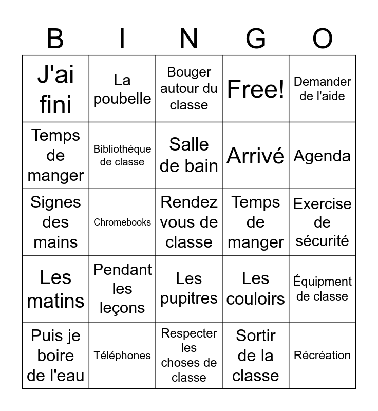 This bingo card has 26 words: Les matins, Téléphones, Salle de bain, Sortir de la classe, Demander de l'aide, J'ai fini, Bibliothéque de classe, Bouger autour du classe, Arrivé, Récréation, Temps de manger, Chromebooks, Respecter les choses de classe, Les couloirs, Exercise de sécurité, Table de Madame, La poubelle, Les pupitres, Free!, Équipment de classe, Signes des mains, Pendant les leçons, Rendez vous de classe, Temps de manger, Agenda and Puis je boire de l'eau.