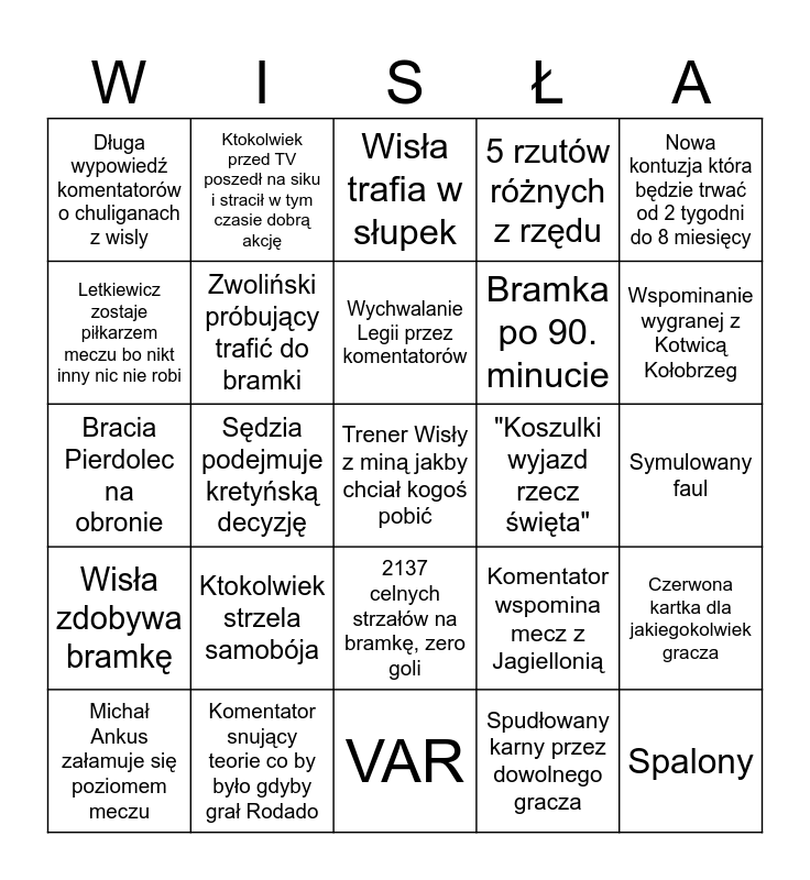 This bingo card has 35 words: Sędzia Legionista, Baena na prawa stronę i dośrodkowanie w trybuny, Kibice Wisly głośniejsi niż gospodarze mimo że nie ma ich dużo na stadionie, Zwoliński próbujący trafić do bramki, 2137 celnych strzałów na bramkę, zero goli, 5 rzutów różnych z rzędu, Letkiewicz zostaje piłkarzem meczu bo nikt inny nic nie robi, Uryga kłóci się z co najmniej 3 osobami, Wychwalanie Legii przez komentatorów, Jaroch nie umie przyjąć piłki, Bracia Pierdolec na obronie, Nowa kontuzja która będzie trwać od 2 tygodni do 8 miesięcy, Rasiści faulują Igbekeme, Baena boi sie strzelać więc czeka na Zielinskiego przez co traci akcję, Długa wypowiedź komentatorów o chuliganach z wisly, "Koszulki wyjazd rzecz święta", Spudłowany karny przez dowolnego gracza, Sędzia podejmuje kretyńską decyzję, Wisła zdobywa bramkę, Trener Wisły z miną jakby chciał kogoś pobić, Komentator wspomina mecz z Jagiellonią, Michał Ankus załamuje się poziomem meczu, Czerwona kartka dla jakiegokolwiek gracza, Komentator snujący teorie co by było gdyby grał Rodado, Wisła trafia w słupek, Wspominanie wygranej z Kotwicą Kołobrzeg, Spalony, Ktokolwiek przed TV zaintonował przyśpiewkę Wisły, Bramka po 90. minucie, Symulowany faul, Historie sprzed co najmniej 10 lat o Wiśle lub Warcie, VAR, Ktokolwiek strzela samobója, Ktokolwiek przed TV poszedł na siku i stracił w tym czasie dobrą akcję and Wujkowe wymądrzanie się przed TV że trener podejmuje złe decyzje.