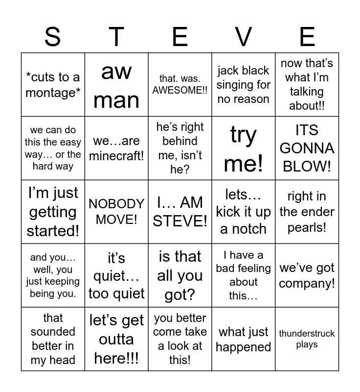 This bingo card has a free space and 24 words: it’s quiet…too quiet, let’s get outta here!!!, he’s right behind me, isn’t he?, that sounded better in my head, now that’s what I’m talking about!!, *cuts to a montage*, we can do this the easy way… or the hard way, aw man, lets… kick it up a notch, is that all you got?, try me!, I’m just getting started!, I have a bad feeling about this…, we’ve got company!, we…are minecraft!, what just happened, right in the ender pearls!, that. was. AWESOME!!, ITS GONNA BLOW!, NOBODY MOVE!, thunderstruck plays, and you… well, you just keeping being you., jack black singing for no reason and you better come take a look at this!.