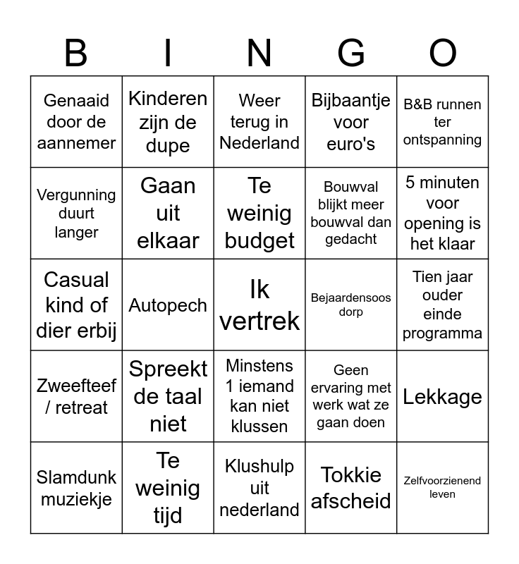 This bingo card has a free space and 24 words: Spreekt de taal niet, Te weinig tijd, Te weinig budget, Slamdunk muziekje, B&B runnen ter ontspanning, Genaaid door de aannemer, Vergunning duurt langer, Kinderen zijn de dupe, Bejaardensoos dorp, Minstens 1 iemand kan niet klussen, Bouwval blijkt meer bouwval dan gedacht, Casual kind of dier erbij, Geen ervaring met werk wat ze gaan doen, Lekkage, Gaan uit elkaar, Tokkie afscheid, Tien jaar ouder einde programma, Weer terug in Nederland, 5 minuten voor opening is het klaar, Autopech, Zelfvoorzienend leven, Zweefteef / retreat, Bijbaantje voor euro's and Klushulp uit nederland.