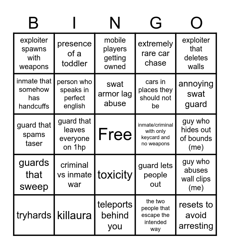 This bingo card has a free space and 27 words: guard lets people out, inmate uprising, overpowers criminals, cars in places they should not be, teleports behind you, inmate that somehow has handcuffs, mobile players getting owned, presence of a toddler, guards that sweep, inmate/criminal with only keycard and no weapons, guy who abuses wall clips (me), guard that spams taser, extremely rare car chase, tryhards, killaura, annoying swat guard, guard kills everyone, becomes inmate, person who speaks in perfect english, swat armor lag abuse, criminal vs inmate war, exploiter spawns with weapons, guy who hides out of bounds (me), the two people that escape the intended way, guard that leaves everyone on 1hp, resets to avoid arresting, toxicity, exploiter that deletes walls and flying or high walkspeed.