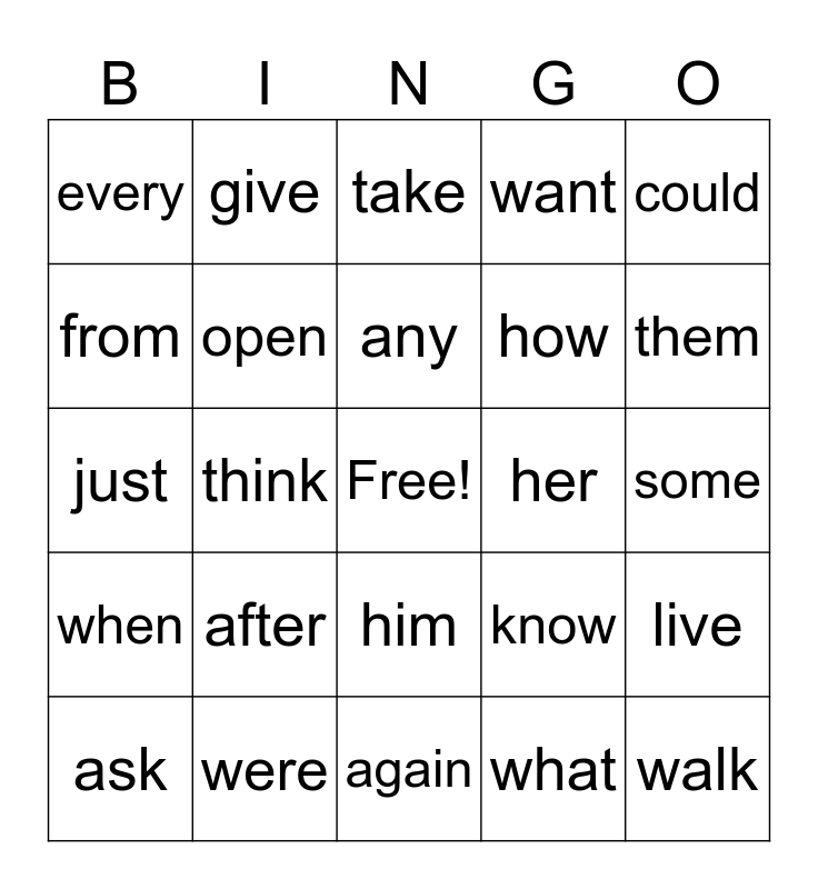 This bingo card has a free space and 25 words: after, again, any, ask, could, every, from, give, her, him, how, just, know, live, open, over, some, take, them, think, walk, were, when, want and what.
