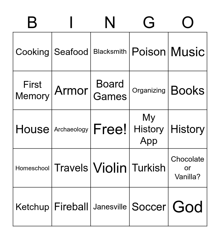 This bingo card has a free space and 24 words: Travels, Fireball, Board Games, Ketchup, Music, Cooking, First Memory, Seafood, My History App, Violin, Organizing, House, Turkish, Chocolate or Vanilla?, Armor, Soccer, History, Blacksmith, Books, Archaeology, God, Homeschool, Poison and Janesville.