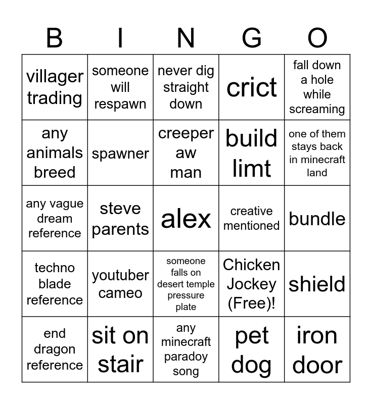 This bingo card has 25 words: youtuber cameo, any minecraft paradoy song, creeper aw man, end dragon reference, fall down a hole while screaming, villager trading, any animals breed, someone will respawn, creative mentioned, someone falls on desert temple pressure plate, build limt, any vague dream reference, Chicken Jockey (Free)!, shield, spawner, iron door, bundle, never dig straight down, one of them stays back in minecraft land, steve parents, alex, sit on stair, techno blade reference, crict and pet dog.