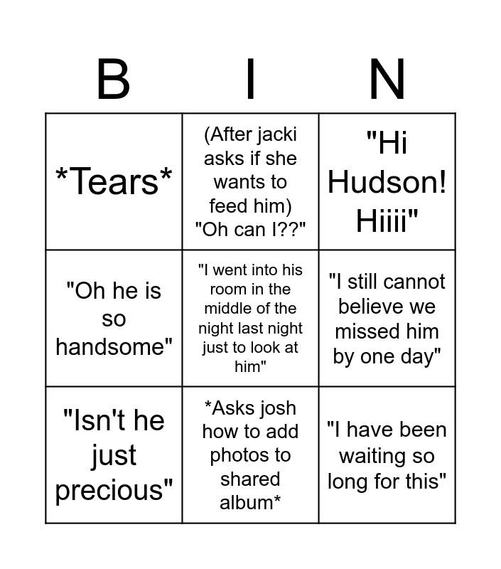 This bingo card has 9 words: "Isn't he just precious", "Hi Hudson! Hiiii", (After jacki asks if she wants to feed him) "Oh can I??", "Oh he is so handsome", *Tears*, "I still cannot believe we missed him by one day", "I went into his room in the middle of the night last night just to look at him", "I have been waiting so long for this" and *Asks josh how to add photos to shared album*.