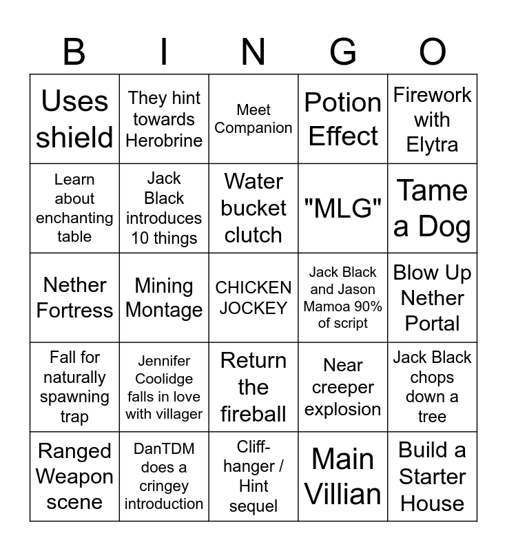 This bingo card has a free space and 24 words: Jennifer Coolidge falls in love with villager, DanTDM does a cringey introduction, Water bucket clutch, Ranged Weapon scene, Firework with Elytra, Uses shield, Learn about enchanting table, They hint towards Herobrine, Jack Black and Jason Mamoa 90% of script, Return the fireball, "MLG", Nether Fortress, Near creeper explosion, Jack Black chops down a tree, Jack Black introduces 10 things, Main Villian, Blow Up Nether Portal, Meet Companion, Tame a Dog, Mining Montage, Build a Starter House, Fall for naturally spawning trap, Potion Effect and Cliff-hanger / Hint sequel.