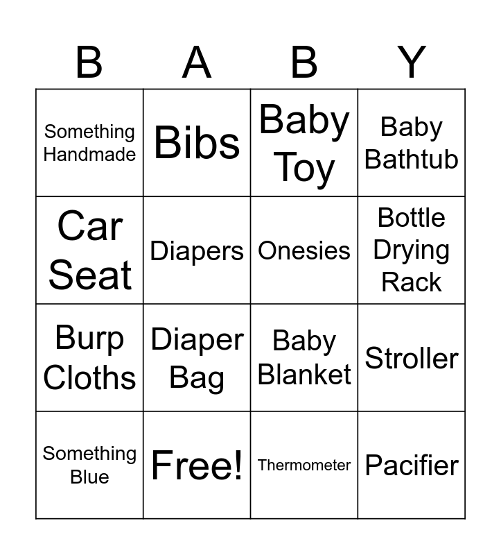 This bingo card has 21 words: Free!, Baby Shampoo, Bibs, Rattle, Thermometer, Onesies, Something Handmade, Baby Toy, Baby Blanket, Bottle Drying Rack, Burp Cloths, Baby Bathtub, Pacifier, Bottles, Diapers, Baby Shoes, Something Blue, Diaper Bag, Car Seat, Stroller and Baby Lotion.