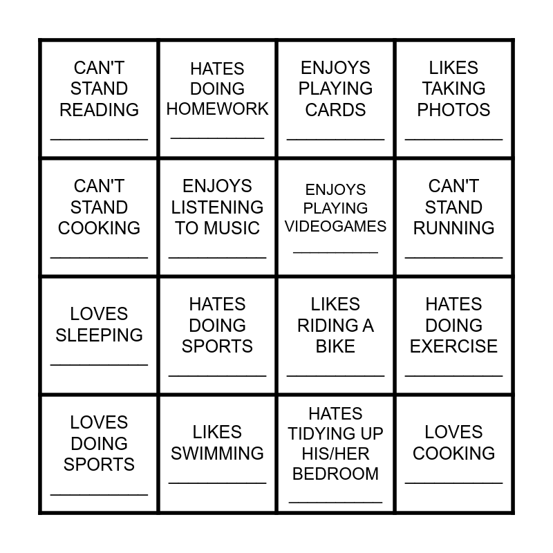 This bingo card has 16 words: LIKES SWIMMING __________, HATES DOING EXERCISE __________, ENJOYS PLAYING CARDS __________, CAN'T STAND READING __________, LOVES SLEEPING __________, HATES DOING HOMEWORK __________, LIKES RIDING A BIKE __________, HATES TIDYING UP HIS/HER BEDROOM __________, CAN'T STAND COOKING __________, ENJOYS LISTENING TO MUSIC __________, LOVES DOING SPORTS __________, LIKES TAKING PHOTOS __________, HATES DOING SPORTS __________, CAN'T STAND RUNNING __________, ENJOYS PLAYING VIDEOGAMES __________ and LOVES COOKING __________.