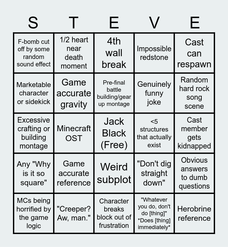 This bingo card has a free space and 24 words: MCs being horrified by the game logic, Game accurate reference, Pre-final battle building/gear up montage, "Whatever you do, don't do [thing]" *Does [thing] immediately*, Cast can respawn, F-bomb cut off by some random sound effect, 1/2 heart near death moment, 4th wall break, <5 structures that actually exist, Cast member gets kidnapped, Excessive crafting or building montage, Game accurate gravity, "Don't dig straight down", Obvious answers to dumb questions, Marketable character or sidekick, "Creeper? Aw, man.", Character breaks block out of frustration, Impossible redstone, Random hard rock song scene, Any "Why is it so square", Minecraft OST, Weird subplot, Genuinely funny joke and Herobrine reference.