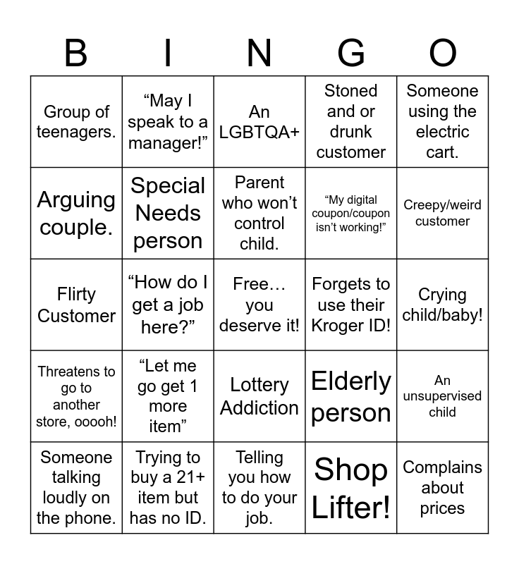 This bingo card has a free space and 24 words: “Let me go get 1 more item”, Trying to buy a 21+ item but has no ID., Parent who won’t control child., Someone talking loudly on the phone., Someone using the electric cart., Group of teenagers., Arguing couple., “May I speak to a manager!”, Forgets to use their Kroger ID!, Lottery Addiction, “My digital coupon/coupon isn’t working!”, Flirty Customer, Elderly person, An unsupervised child, Special Needs person, Shop Lifter!, Crying child/baby!, An LGBTQA+, Creepy/weird customer, “How do I get a job here?”, Complains about prices, Threatens to go to another store, ooooh!, Stoned and or drunk customer and Telling you how to do your job..