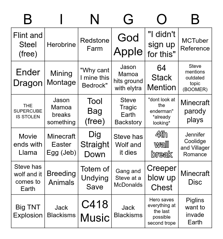 This bingo card has 36 words: Gang and Steve at a McDonalds, Totem of Undying Save, Jack Blackisms, Ender Dragon, Movie ends with Llama, Steve Tragic Earth Backstory, Mining Montage, C418 Music, "I didn't sign up for this", Creeper blow up Chest, Steve mentions outdated topic (BOOMER), God Apple, Minecraft Disc, Jason Mamoa breaks something, Jason Mamoa hits ground with elytra, Flint and Steel (free), Steve has wolf and it comes to Earth, "dont look at the enderman" *already looking*, THE SUPERCUBE IS STOLEN, Redstone Farm, Tool Bag (free), Minecraft Easter Egg (Jeb), Steve has Wolf and it dies, Dig Straight Down, 4th wall break, Herobrine, 64 Stack Mention, Jack Blackisms, "Why cant I mine this Bedrock", MCTuber Reference, Piglins want to invade Earth, Big TNT Explosion, Jennifer Coolidge and Villager Romance, Minecraft parody plays, Breeding Animals and Hero saves everything at the last possible second trope.