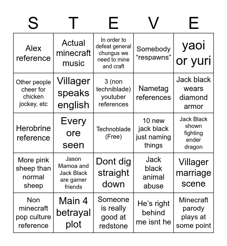 This bingo card has a free space and 24 words: Jason Mamoa and Jack Black are gamer friends, Main 4 betrayal plot, 3 (non techniblade) youtuber references, Non minecraft pop culture reference, yaoi or yuri, Alex reference, Other people cheer for chicken jockey, etc, Actual minecraft music, 10 new jack black just naming things, Dont dig straight down, Nametag references, Herobrine reference, Jack black animal abuse, Villager marriage scene, Villager speaks english, He’s right behind me isnt he, Jack Black shown fighting ender dragon, In order to defeat general chungus we need to mine and craft, Jack black wears diamond armor, Every ore seen, Minecraft parody plays at some point, More pink sheep than normal sheep, Somebody “respawns” and Someone is really good at redstone.