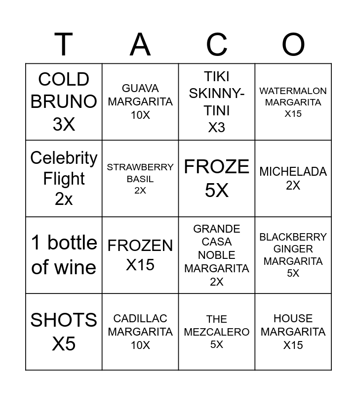 This bingo card has 16 words: CADILLAC MARGARITA 10X, BLACKBERRY GINGER MARGARITA 5X, TIKI SKINNY-TINI X3, COLD BRUNO 3X, 1 bottle of wine, GUAVA MARGARITA 10X, GRANDE CASA NOBLE MARGARITA 2X, THE MEZCALERO 5X, Celebrity Flight 2x, STRAWBERRY BASIL 2X, SHOTS X5, WATERMALON MARGARITA X15, FROZEN X15, MICHELADA 2X, FROZE 5X and HOUSE MARGARITA X15.